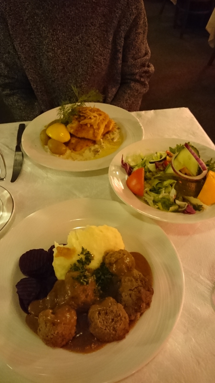 2人でグリーンサラダ、ミートボール、パイクパーチを注文。