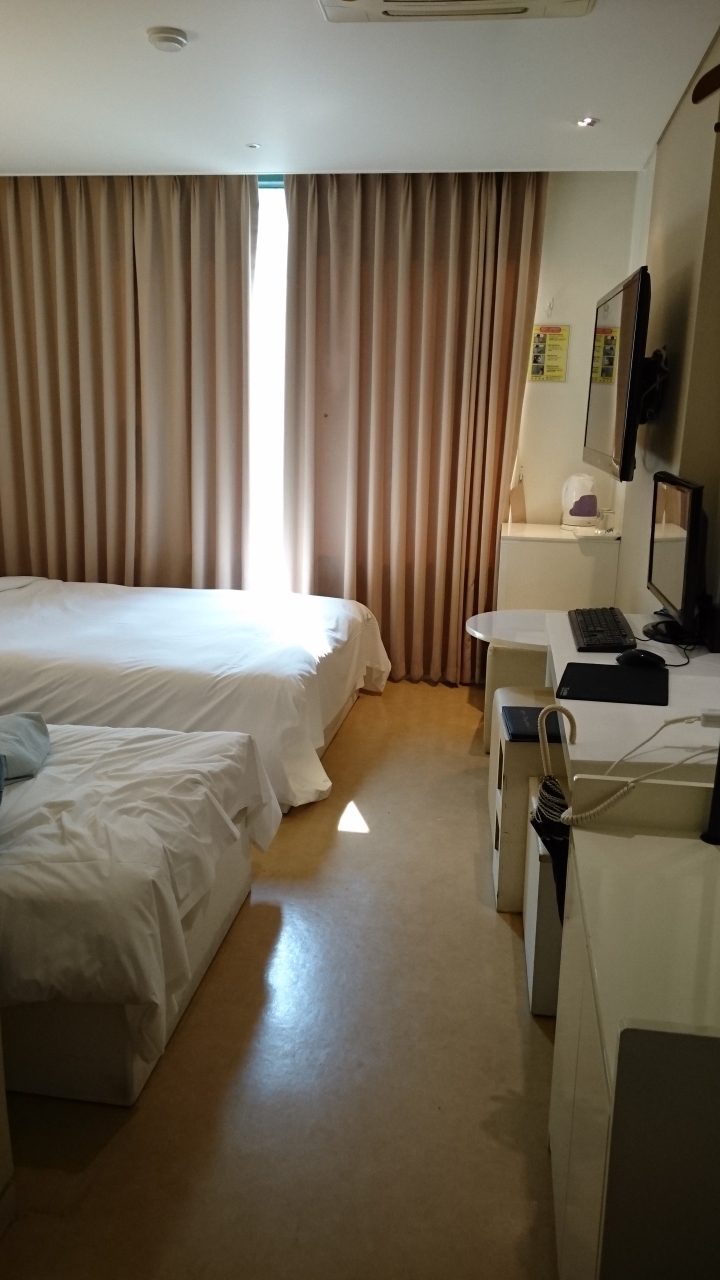通された5Fの部屋はダブルベット+シングルベットのツインルームで、口コミ通り、ハンガーは2本のみ、無料のお水は無し、水周りのドアは完全に閉まらないタイプ・・・