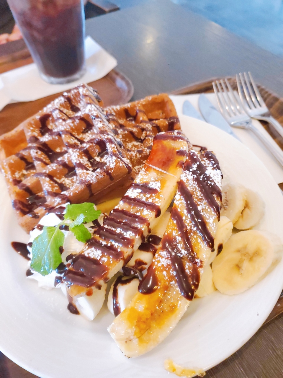 ワッフル美味しそうだったので、どっさりバナナのワッフルとアイスコーヒーをオーダーしました。