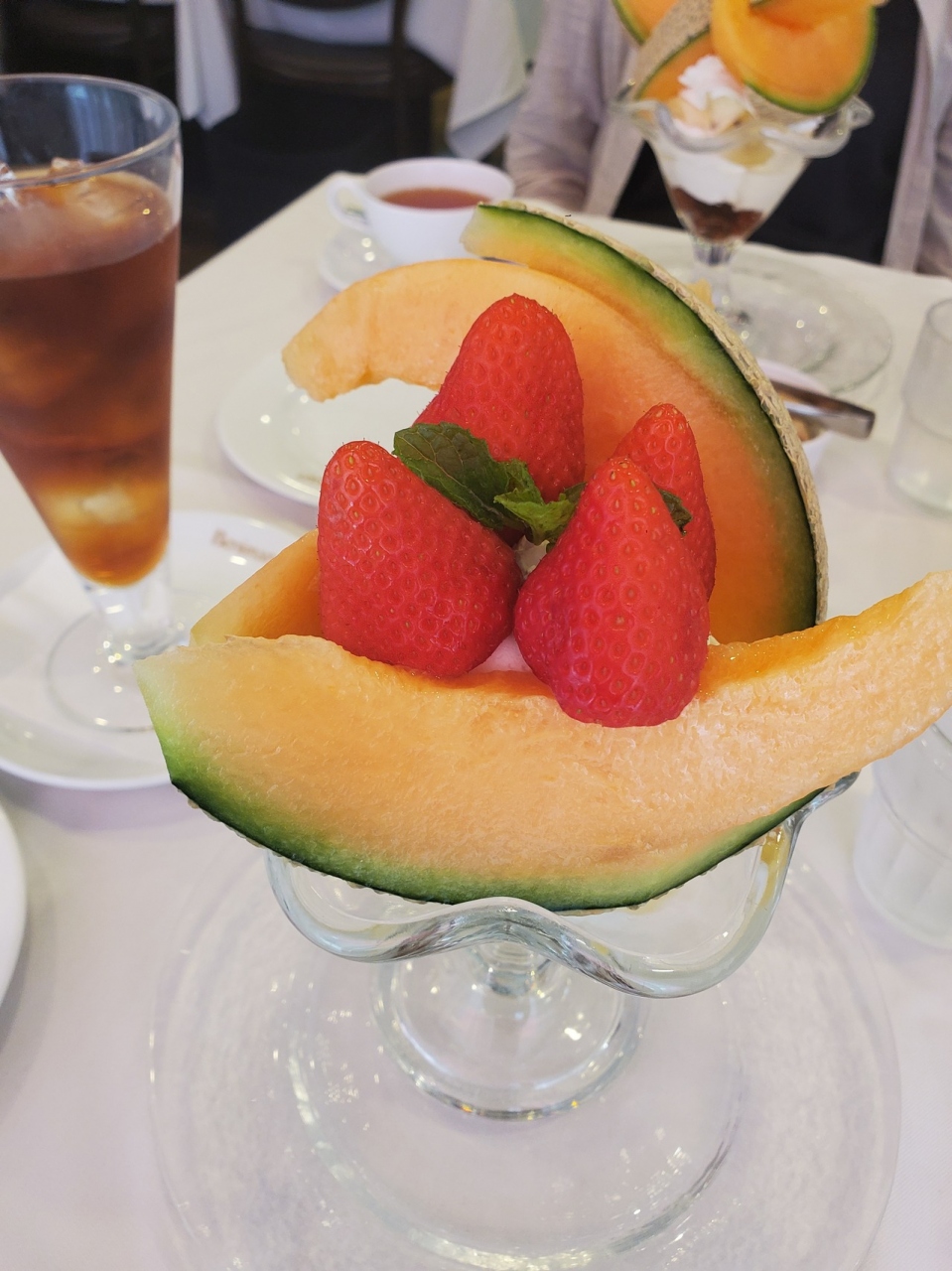 季節限定メニューから悩みに悩んでメロンと苺のパフェにしました。