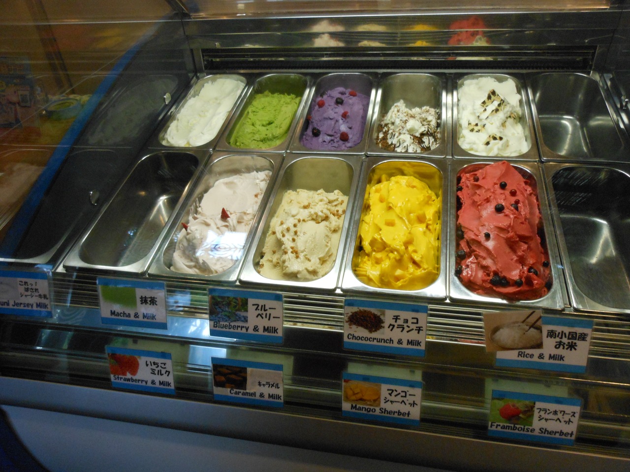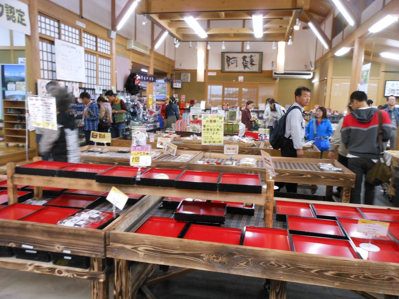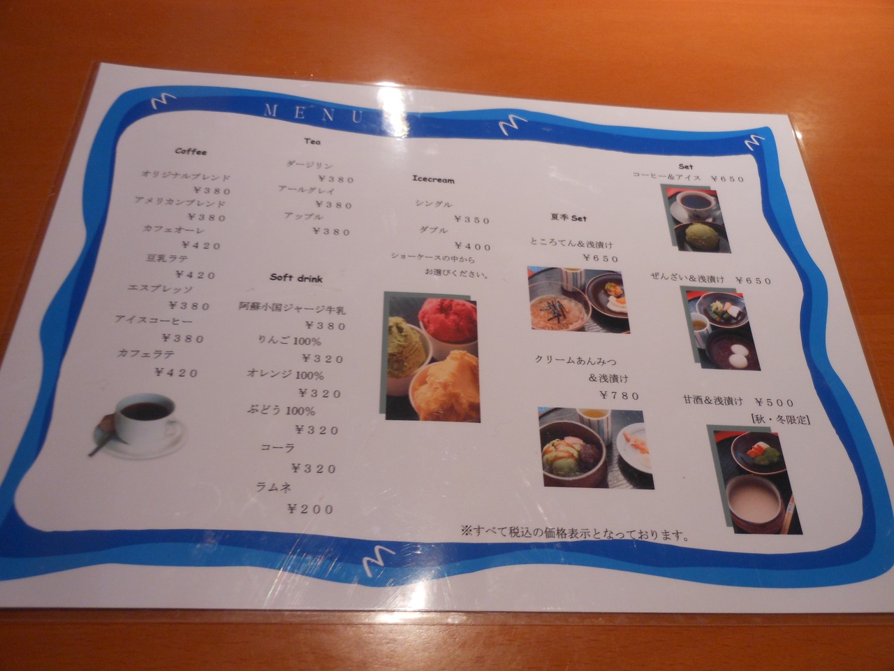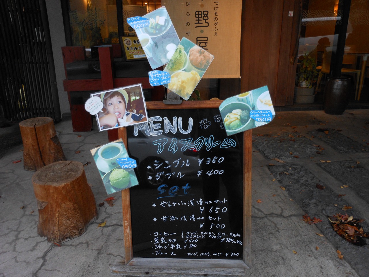 黒川温泉をゆったりと散策後に一休みにつけものやのつけものと同じフロワーにあるカフェ平野屋に入りました。ぜんざいを食べたいと家内が言うので入ってみました。店内にはアイスクリームのいろんな種類が、おみやげ品などがありましたがぜんざいはもちろん美味しいでしたが漬け物が添えられていてそれがいっそうと合うもので美味しく頂けました。
