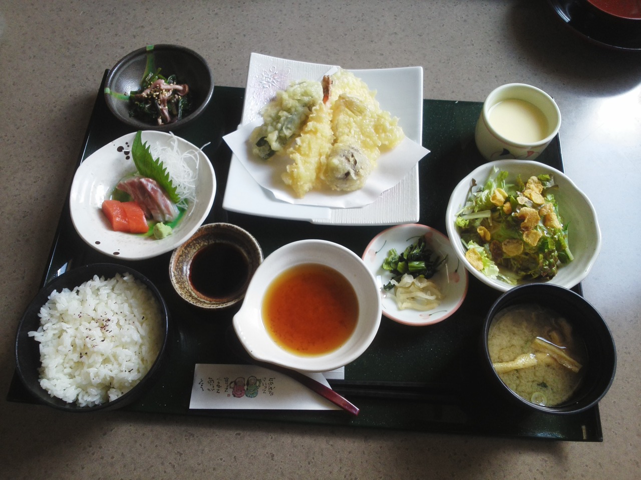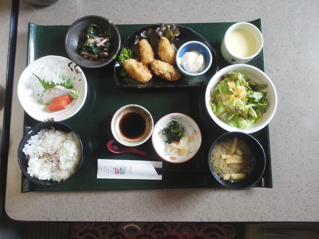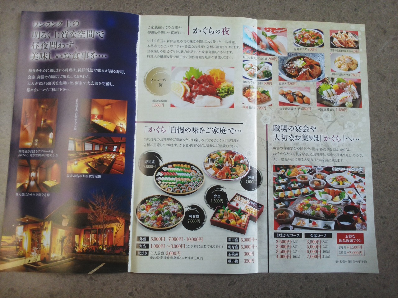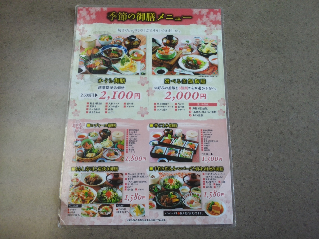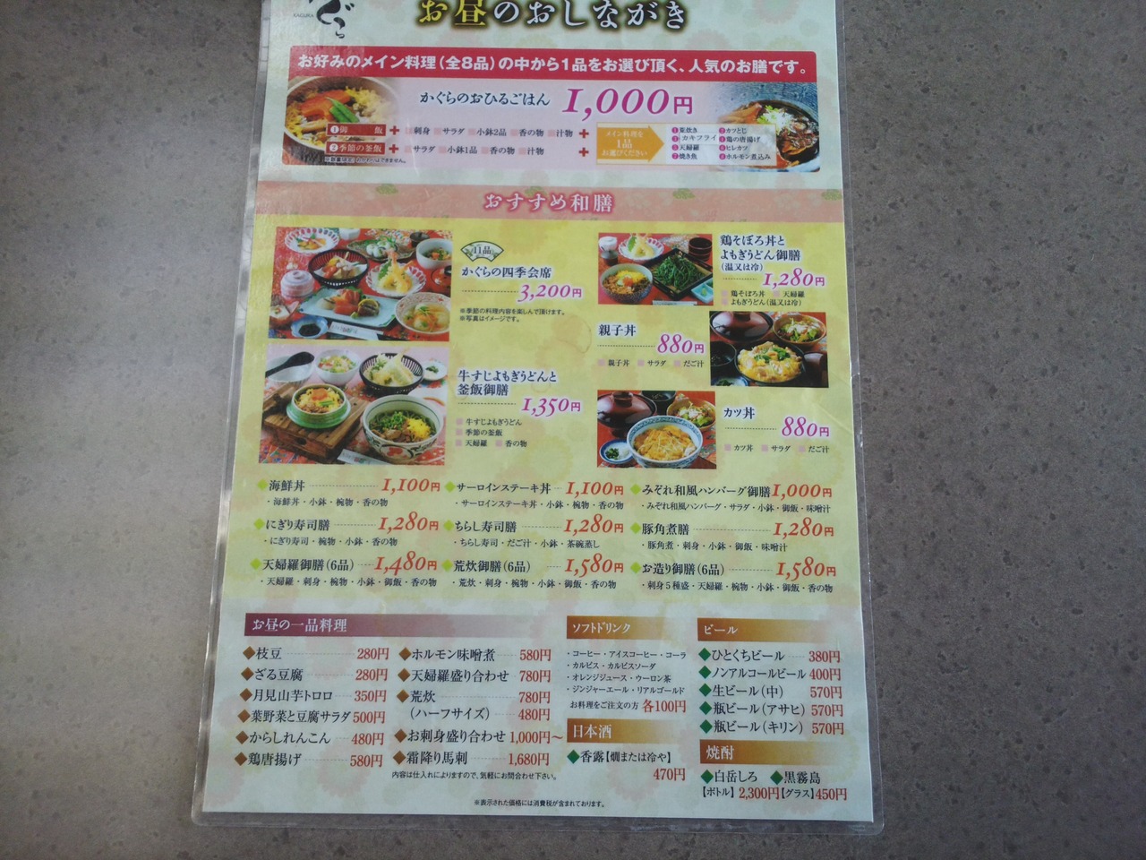 孫の七五三の祈願を終わらせお昼に食菜酒楽「かぐら」に全員で行きました。和食を中心に新鮮活魚や旬の味覚を使った一品料理、寿司などがあります。かぐらのおひるごはん1000円でご飯に刺身、サラダ、小鉢、香の物、味噌汁に8品の中からメインの料理(荒炊き、カツとじ、チキン南蛮、唐揚げ、天ぷら、ヒレカツ、焼き魚、ホルモン煮込み)を選ぶようになっています。他にも御膳がありますがみんな、かぐらのおひるごはんを注文しました。子供たちはカツ丼を頼み半分ずつ分けて食べさせました。ご飯、味噌汁はおかわりが出来ます。