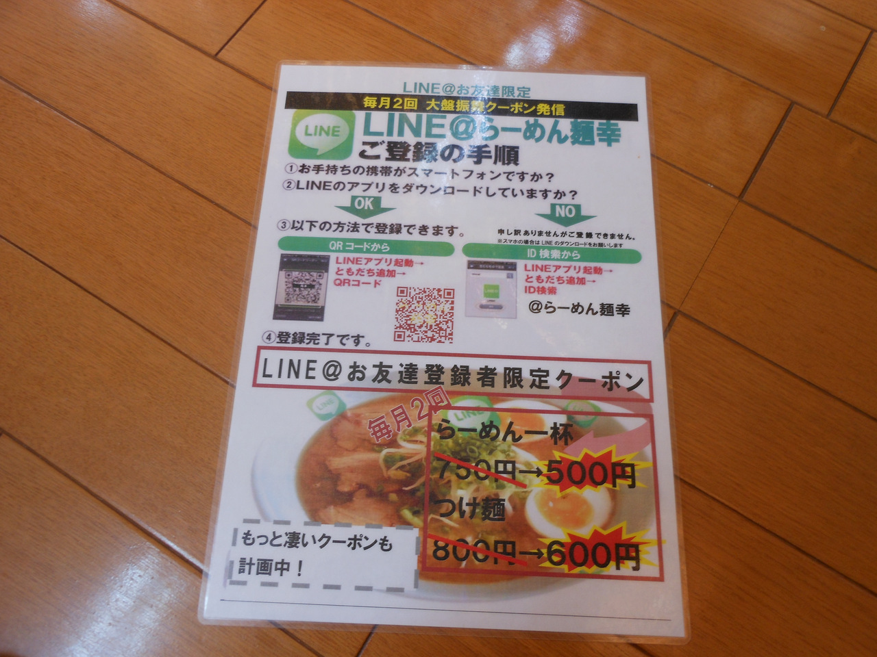 ここは鹿児島県鹿屋市郷之原トンネル交差点近くに有るラーメン麺幸さんです。新装開店されて100日で100円引きでした。人気はつけ麺のようで鹿屋市のラーメン店ではここしかないかと思います。LINE@に登録すると一回だけですがクーポンが使えます。携帯を見せれば良いです。スープは濃厚豚骨魚介(かつお節)を使っています。