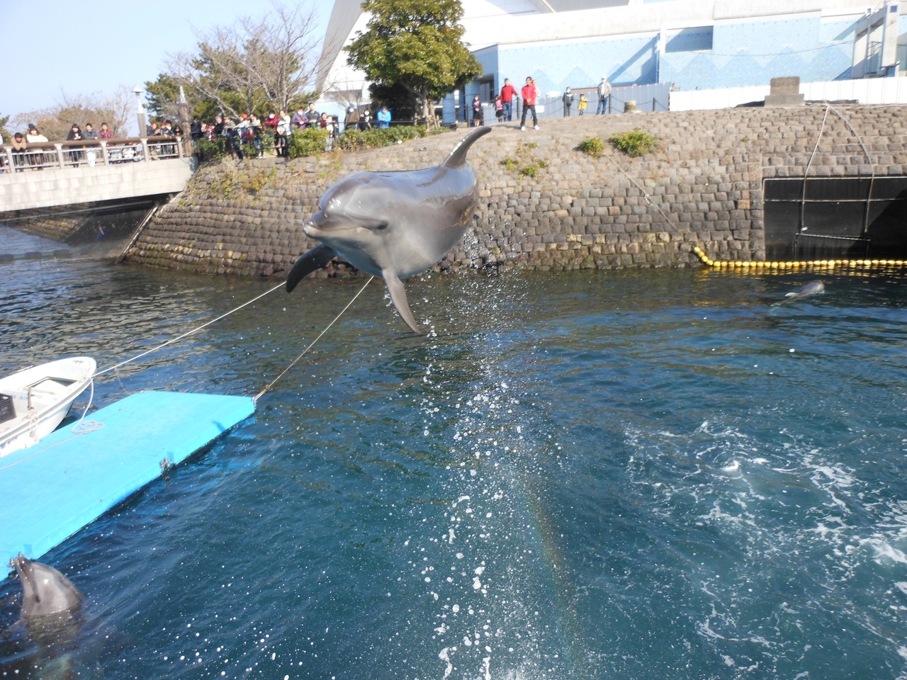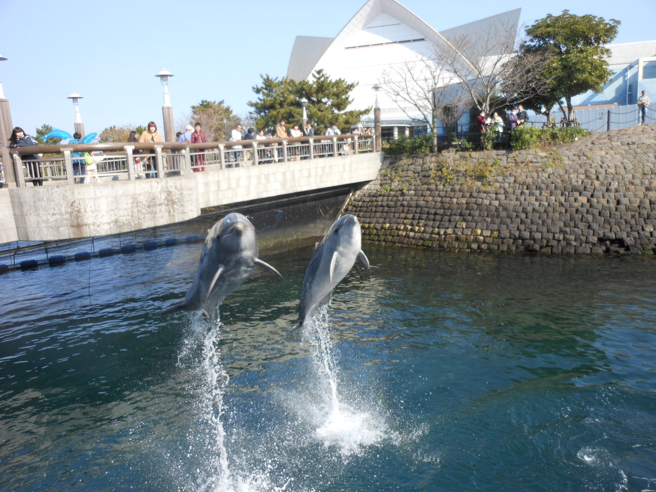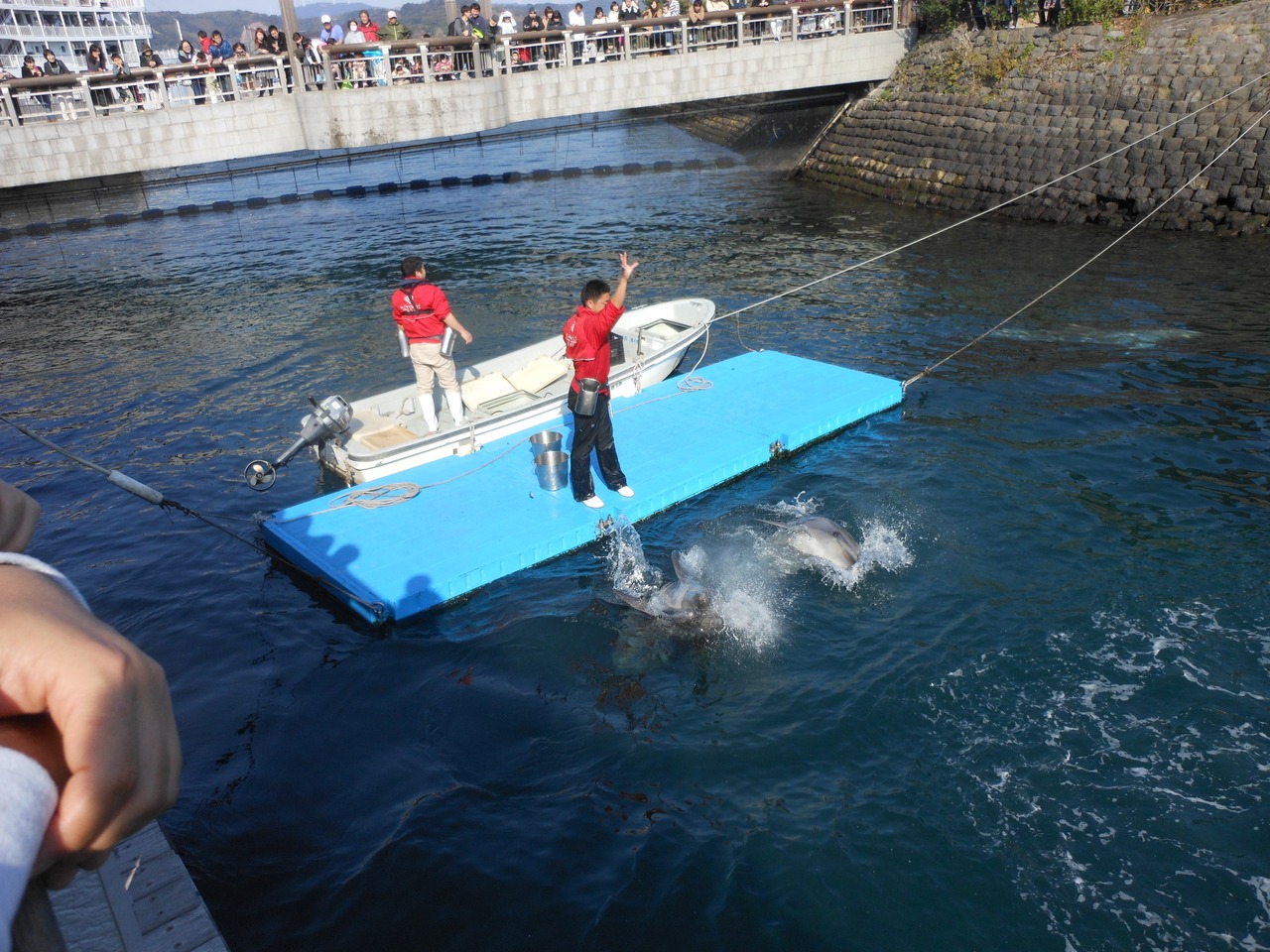 帰り道に水族館の水路の前を通っていたらこれからイルカのショーがあるとのことでちょっと見てみることに!約20分位あったかと思います。よく訓練されているのか飼育員の出した指示に反応して回遊、ジャンプを繰り返しして観客を楽しませていました。時折目の前でジャンプしたりして水しぶきが飛んできたりしました。一日四回行われていますが開演時間を書いた案内があったけど写真を撮るのを忘れました。