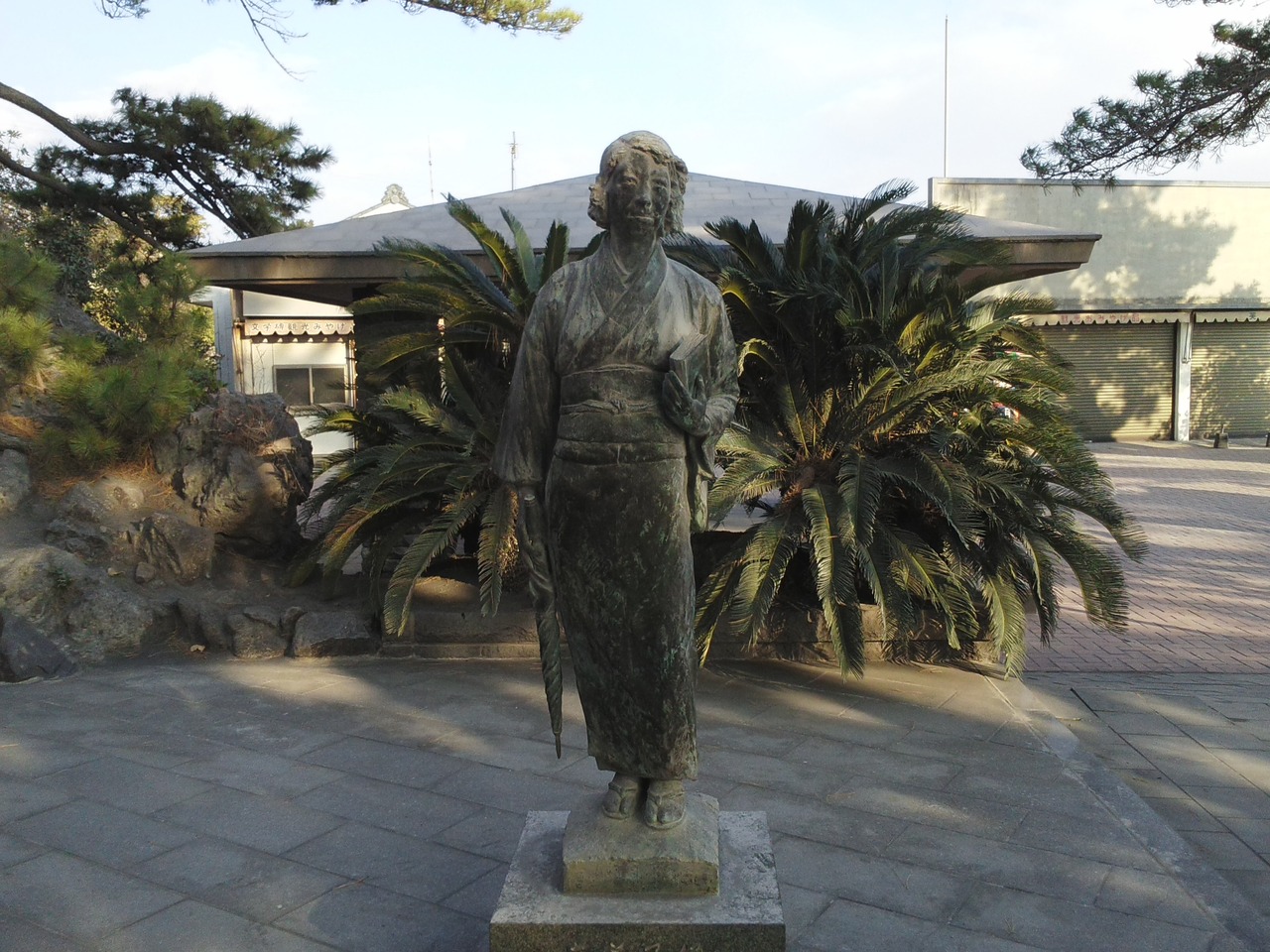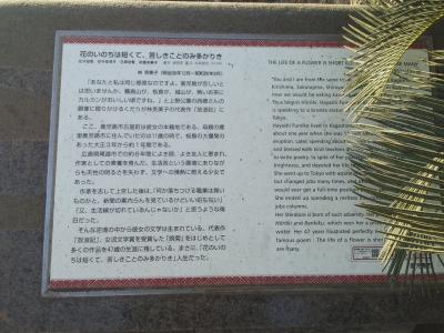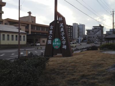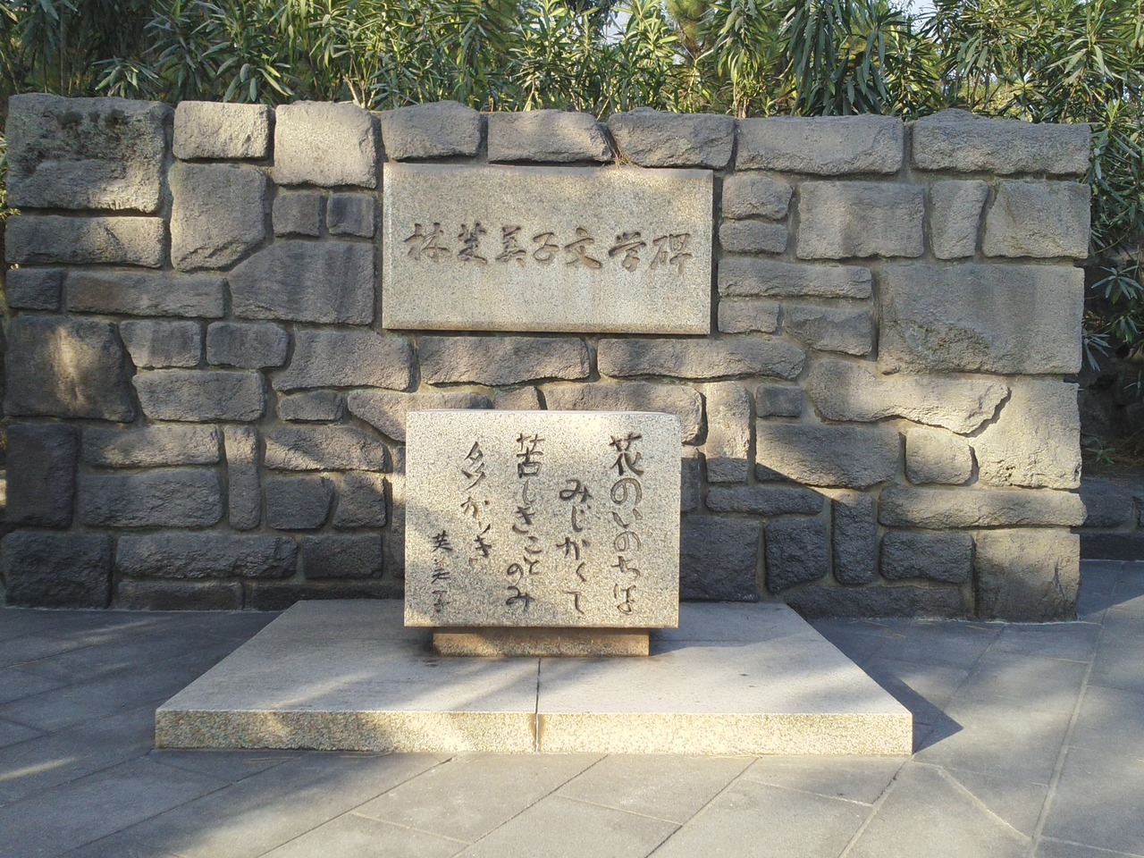 「花のいのちはみじかくて苦しきことのみ多かりき」を刻んだ文学碑が建ちすぐそばに本を抱えた芙美子像が建っている。