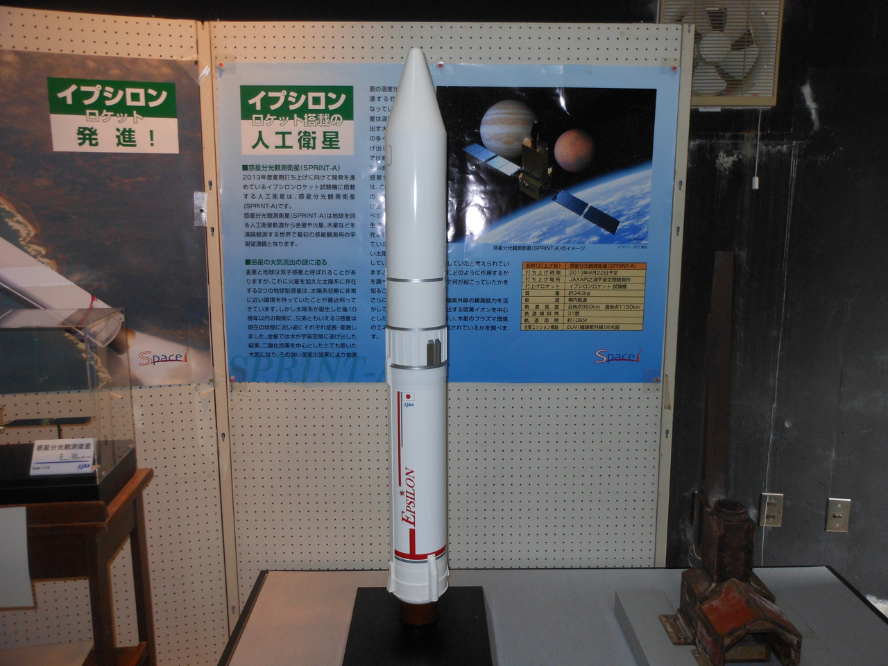 内之浦宇宙空間観測所のすぐそばに美宇橋がありそこを渡って行くと資料館があります。下の方へ細長い建物で入り口を入ると中央にM(ミュー)-3Sロケットが立っています