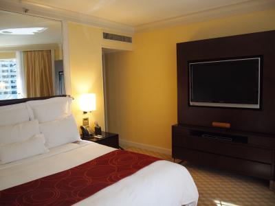同じ立地なのですが、コンラッドにするかこちらにするか迷いました。 窓からコンラッドのプールが見えましたが、プールだけとるとこちらに軍配が上がるような気がしました。 お部屋は豪華なのは当たり前です。 テレビ放送局の一覧表は、竹に彫った巻物風になっていたりと、大変凝っています。 食事なしのプランだったのですが、香港でしたのでそれで十分だと思っています。