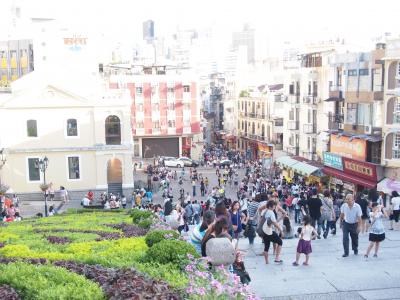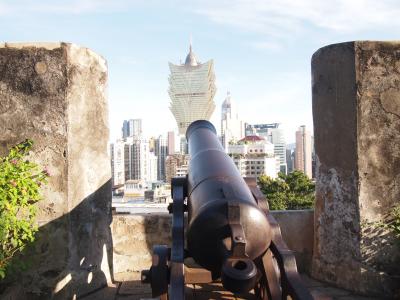 広場の人込みを抜け、案内板に沿って到着しました。 真夏の昼下がり、急な坂道に息を弾ませながら登って行きました。 マカオ市内だけではなく、反対側には中国大陸が広がっています。 ここに、砦を作った意味が良く判ります。 大砲はカジノを狙っています。