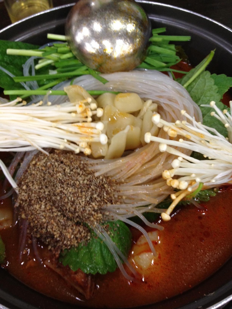 評判の良いお店で、24時間営業ですので、初日の夕食(夜食)選びにはぴったりだと思います。 明洞には2店舗ありますが、口コミサイトでは2号店に分があるような気がします。 2号店も地元の人が多く、珍しいおひとり飯も何人もいるので、入る易いお店なのではないでしょうか。 写真にある左側ゴマっぽっく写っているのは、コショウです。 これから見ても、味はある程度想像できると思います。