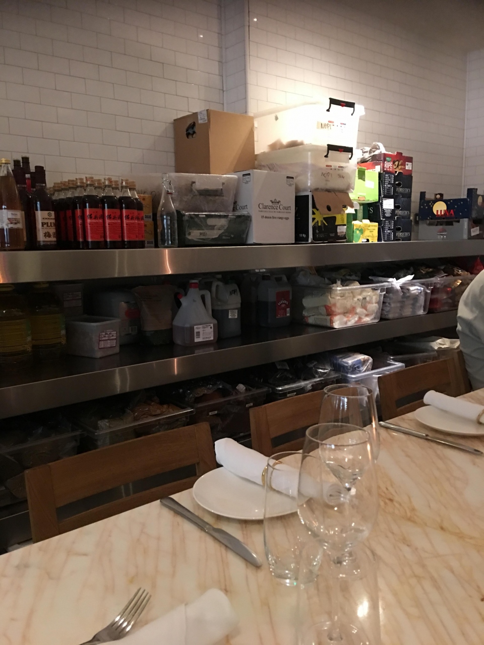 予約をして、地下のお店に行きました。 地下は、15-6人掛けの大きなテーブルが2つあります。 調理場の横を通り、調味料のおいてある倉庫で、いただく感じです。 予約した人は、角々で食事が出来るようですが、予約をしていないと、大テーブルで、並んで食べる形になるようです。(それが嫌で、案内されても座らずに替えるお客さん達もいました。) 日本の調味料を使った料理もメニューにあり、倉庫にも日本酒、みりん、醤油等が置いてあります。