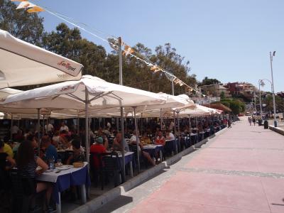 市内から11番のバスに乗り、終点で降りて、公園を過ぎて海を目指します。 ロータリーのチョット手前が、目指すお店です。 日曜日でしたが、メニューにないものが多かったので不思議な感じがしましたが、季節的なものもあるのでしょうか? 早めに行ったので、席は選びたい放題だったのですが、12時過ぎたら席取りのおじさん・おばさんたちで、海に近い席からうまって行きました。 急にウエイターが増えたと思ったら、料理のお皿を数枚持って、「サラダ・トロピカーナ!」、「トロポーカーナ・サラダ!」等、自分の料理を叫びながら、席を回ってきます。 白いテントの海の家風で、ピール(ピッチャー)を飲みながら、至福の時を過ごせます。