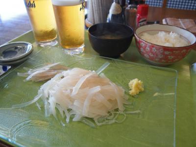 魚市場の2階にある、食堂です。 入り口で守衛さんに「食堂に行きたい」といって、等してもらいました。 魚市場で働いている方たちの食堂ですから、飾り気はあまり期待できません。 イカ刺しは、市場の方たちは飽きているのか、カレー、揚げ物のほうがよく出ているようですが、私たちにはイカの方が新鮮です。 ビールもあるし、いいですね。