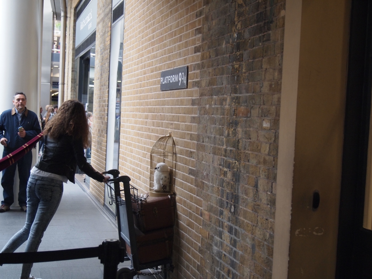 駅に入ると、9 3/4の案内板があり、人が並んでいます。 まあ、撮影まで長いことと言ったら。 まず、マフラーを伸ばして、ジャンプして…。 全員が、同じことをするので、時間が掛かります。 私は、見てるだけで充分でした。
