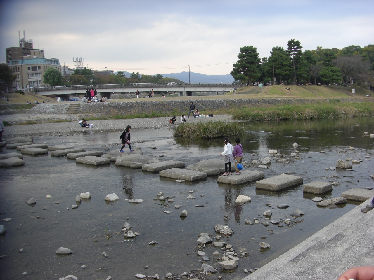 出町柳の駅からすぐの加茂川では飛び石で対岸へ行けるようになっています。これは子供も大喜びで何度も渡って遊んでいました。10月後半のちょうどその日は出町フェスティバルという地域のお祭りが対岸であって、夕暮れ時にジャズが聴けたり、子供向けの読み聞かせがあったり楽しめました。