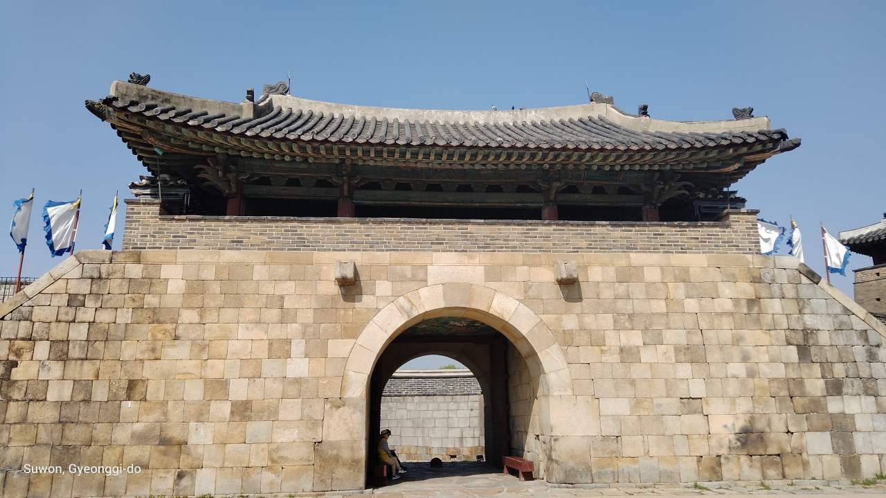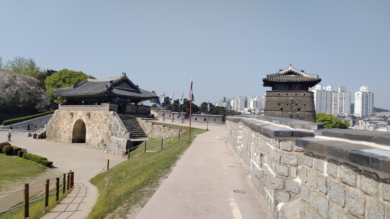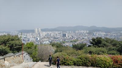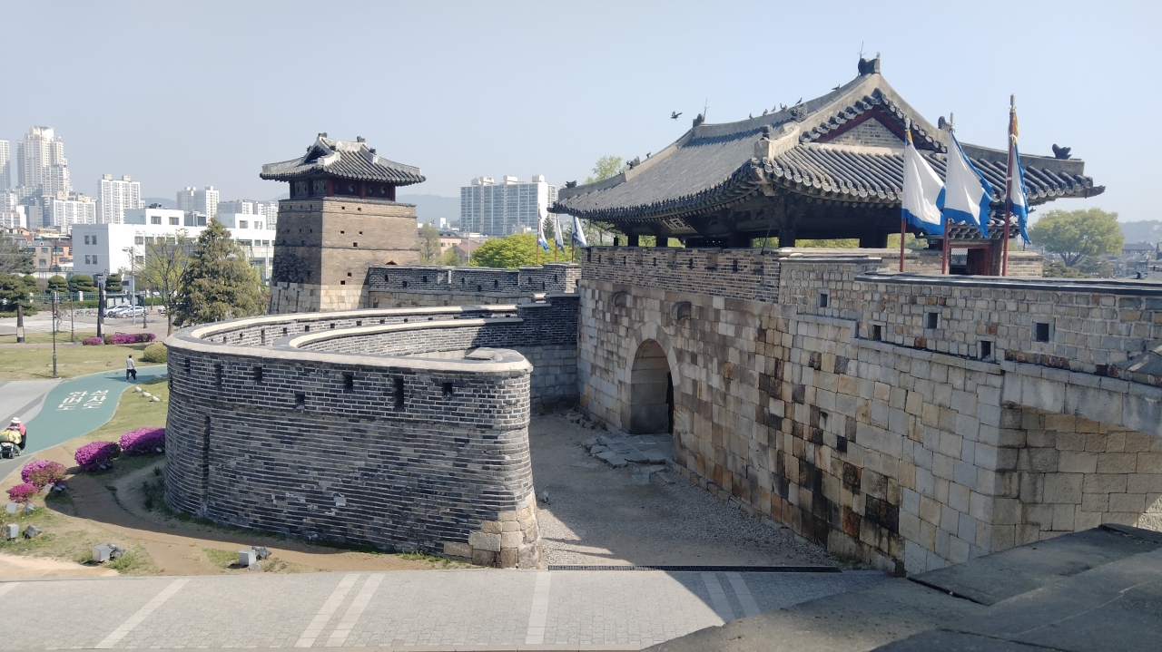 結構な傾斜の遊歩道を10分程度かけて上がりましたが、眼下には八達門や水原市内の街並みやマンション群が一望できました。