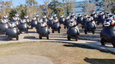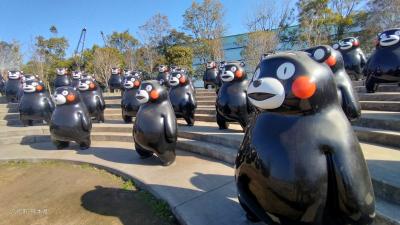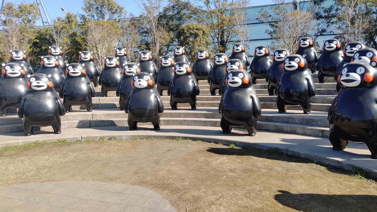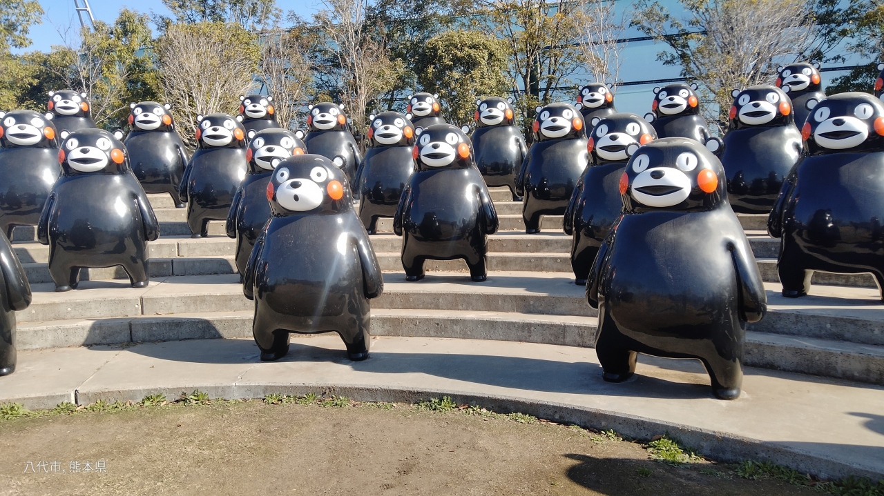 普段はひっそりとした「くまモンポート八代」の公園に数重のくまモンが並んでいます