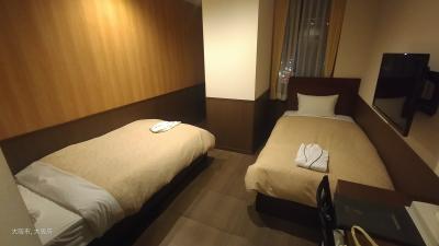 エコノミーツインですが部屋内に太い柱が通っていて、二つのベッドを無理やり押し込んでいました。