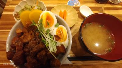 「皮付きの豚バラ肉を2種類の醤油と調味料、クローブや八角などのスパイスと一緒に柔らかく煮込んで作る人気のルーロ―飯(HP情報)」+味噌汁+ミニサラダでした。