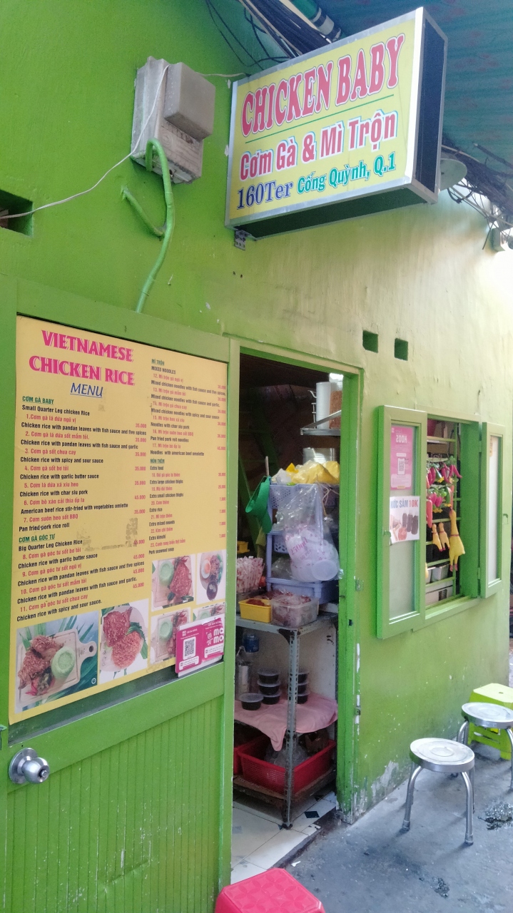 ホーチミンのタイビン市場の近くの路地を入ったところにあるテイクアウト専門店?で、緑の外壁が目印です。