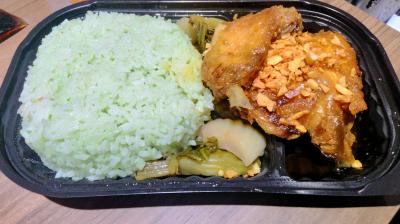 晩ご飯用にミニチキン(210円)をオーダーしましたが、甘辛のチキンが二つのっていて大盛りライスです。
