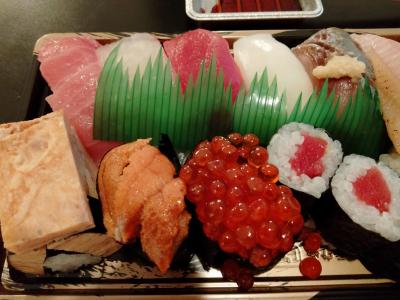 中トロ、ウニ、イクラ、等のネタが並んだ「おもてなし(2、400円)」を2、000円電子マネー還元で購入してホテルでいただきました。
