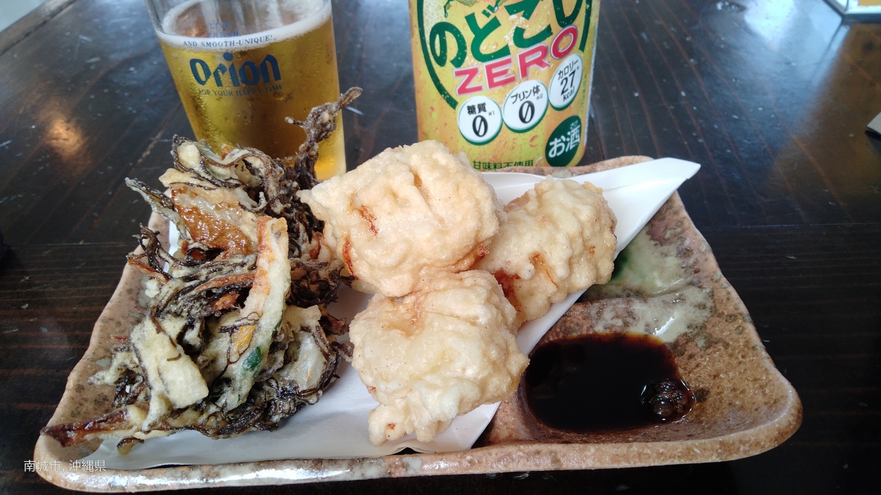 「千ベロ」は、缶ビール、缶チューハイ、缶ハイボールの中から3本と揚げたてのミニ天ぷら盛り(イカ、マグロ、モズクなど)でした。