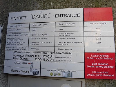 教会の入り口とは別に塔の入り口(広場から向かって右側)があり、入場料(9ユーロ/家族3人)は塔の上で支払いしました。