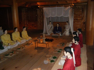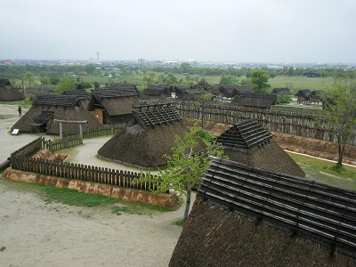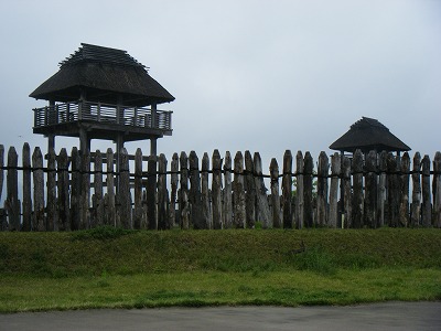 大きな公園内に弥生時代の集落や建物(物見櫓、竪穴住居、集会の館、煮炊き屋など)