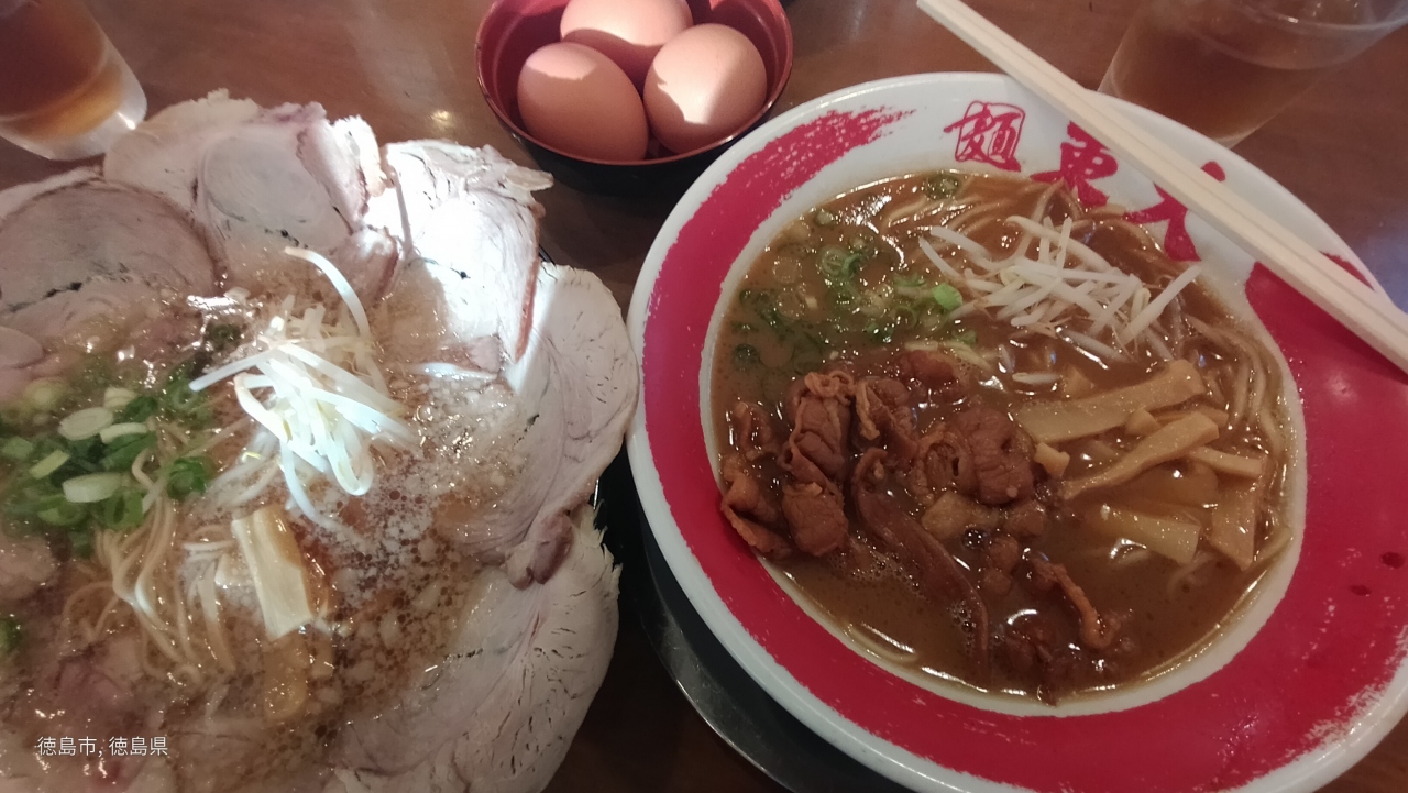 徳島ラーメンは、濃いめの「しょう油とんこつ」スープ、甘辛の豚バラ肉、生卵が特徴らしいです。