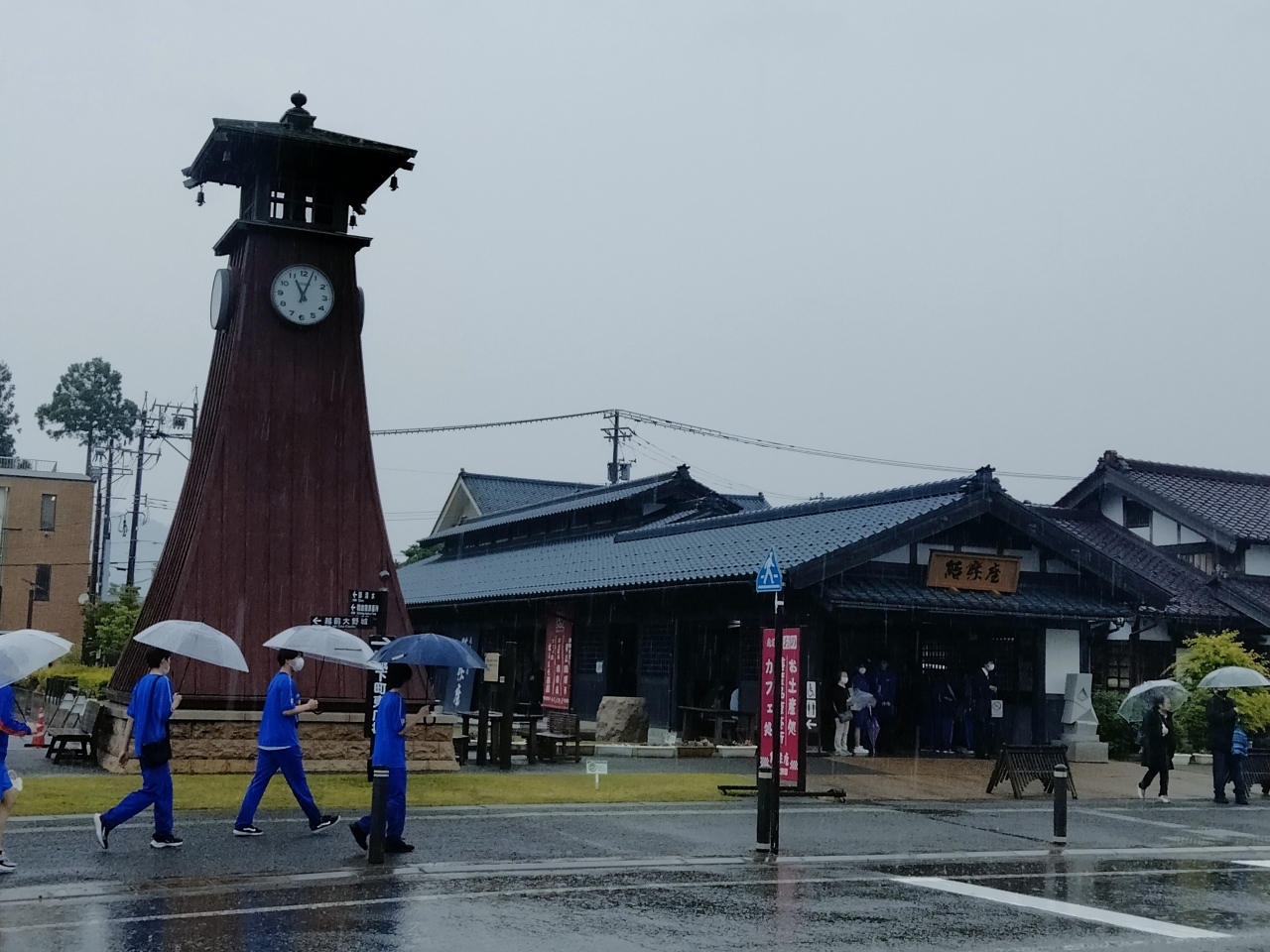 越前大野城のすぐ近くにある「道の駅」で、大きな時計台(時の鐘)が目立ちます。