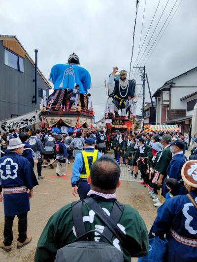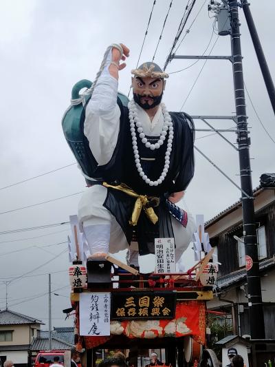 祭りは例年5月19日から21日まで行われますが、偶然3年振りの中日(20日)に三国神社に奉納される巨大な武者人形の曳き山車の巡行を見ることができました。