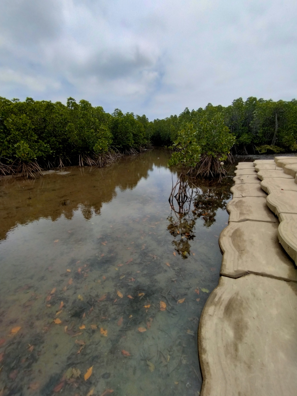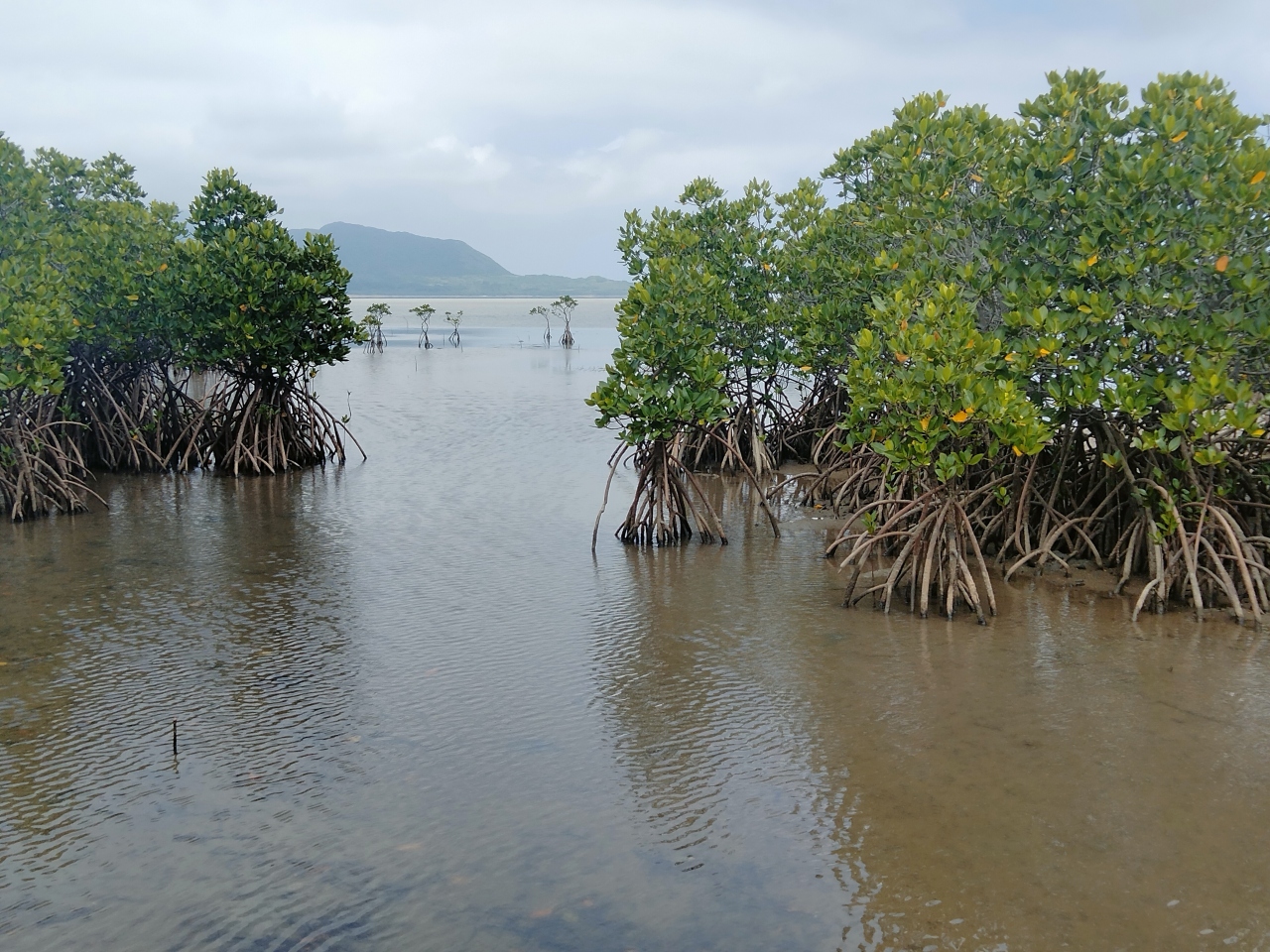 程よいところで護岸堤防の階段があるので、干潟まで下りてまじかにマングローブ林や海辺の生き物を観察できます。