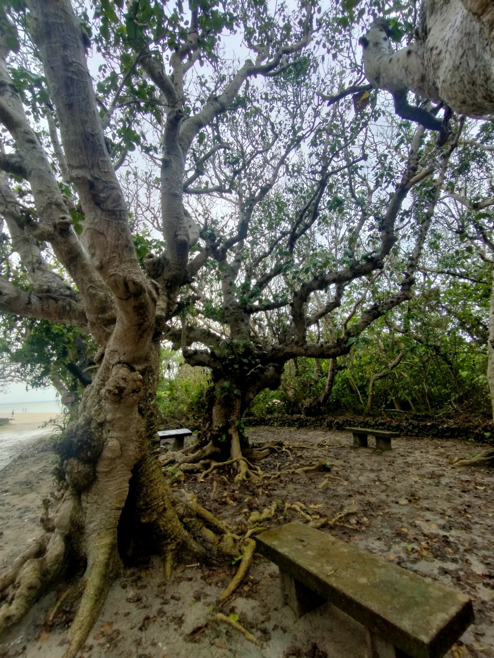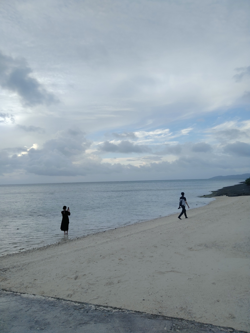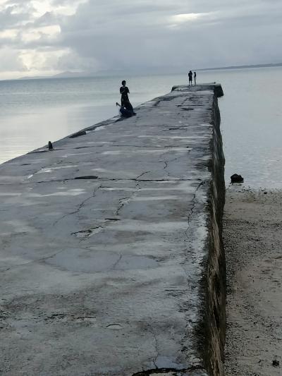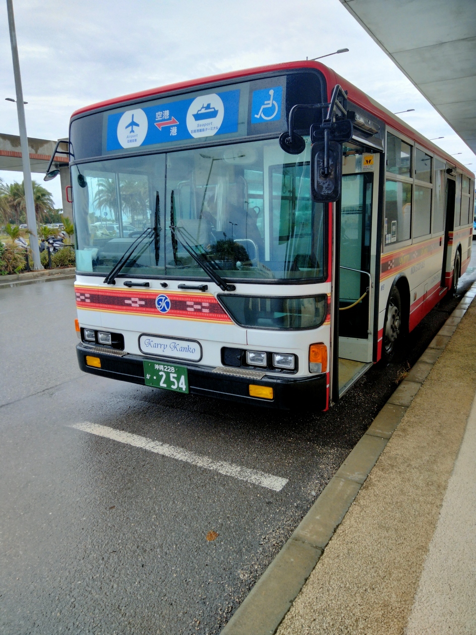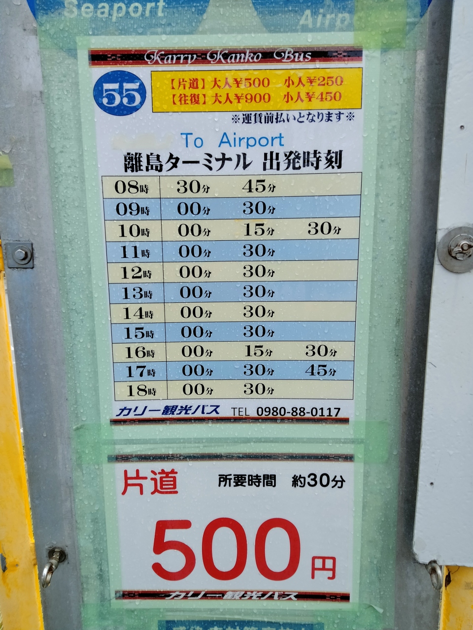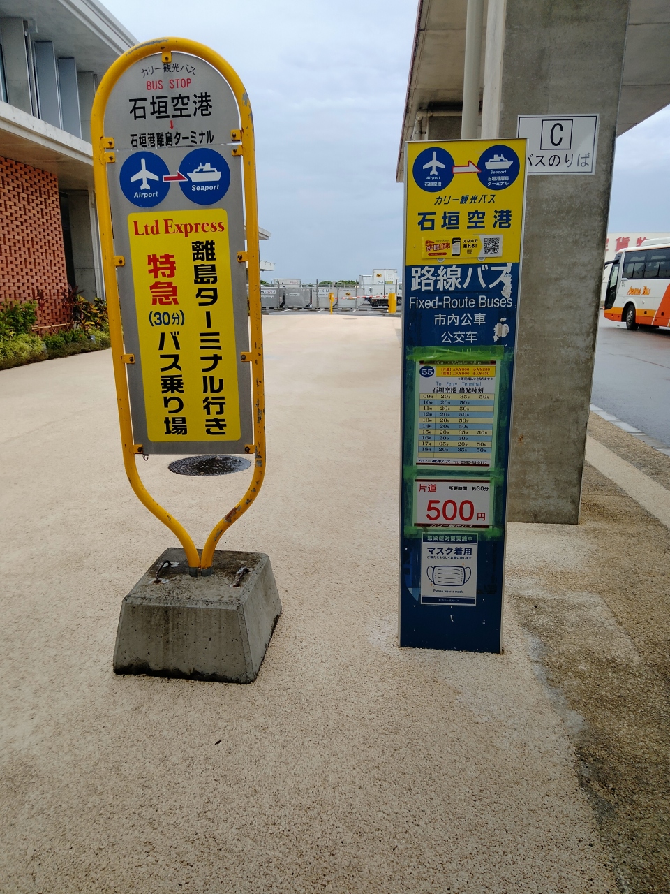 離島ターミナルを出て左側がカリー観光直行バス停(時間表示と500円明示)、右側が東運輸バス停です。- 旅行時期