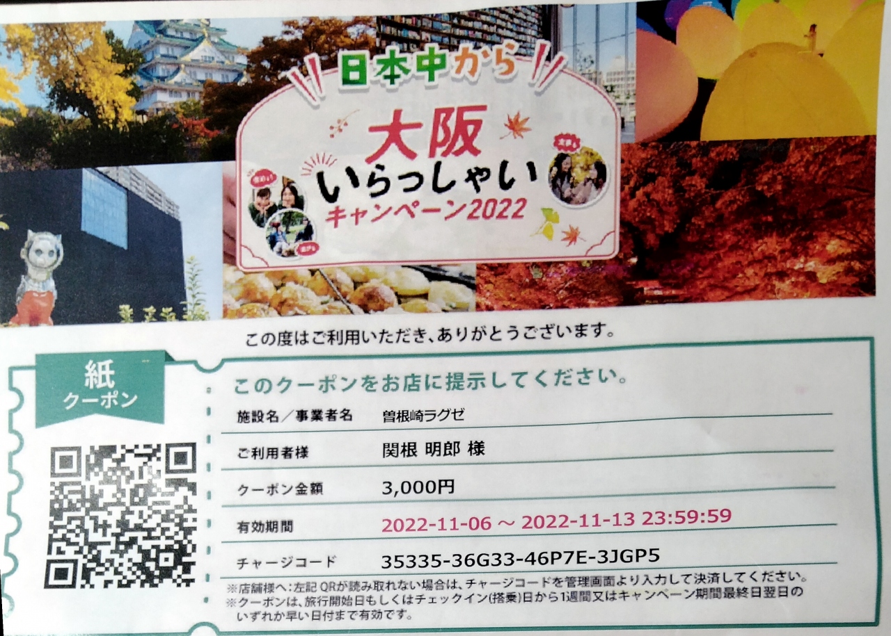 大阪府民割を利用したので、7,000円/泊が3,780円-3,000円クーポンで、実質780円でした。