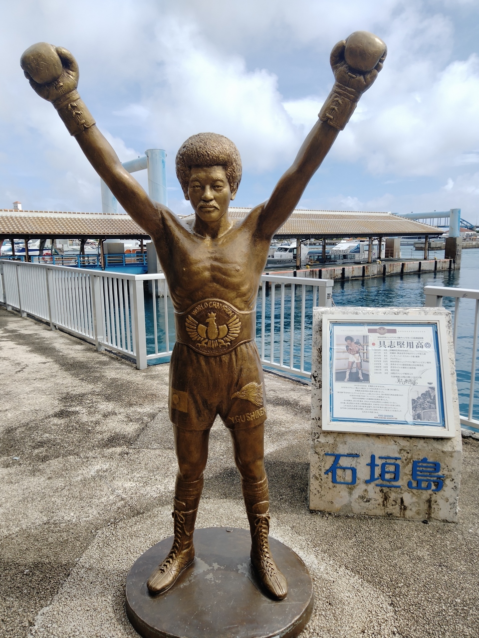 離島ターミナルの桟橋付近に、腰にカンムリワシのベルトを巻き両手を高く上げた姿で建っていました。