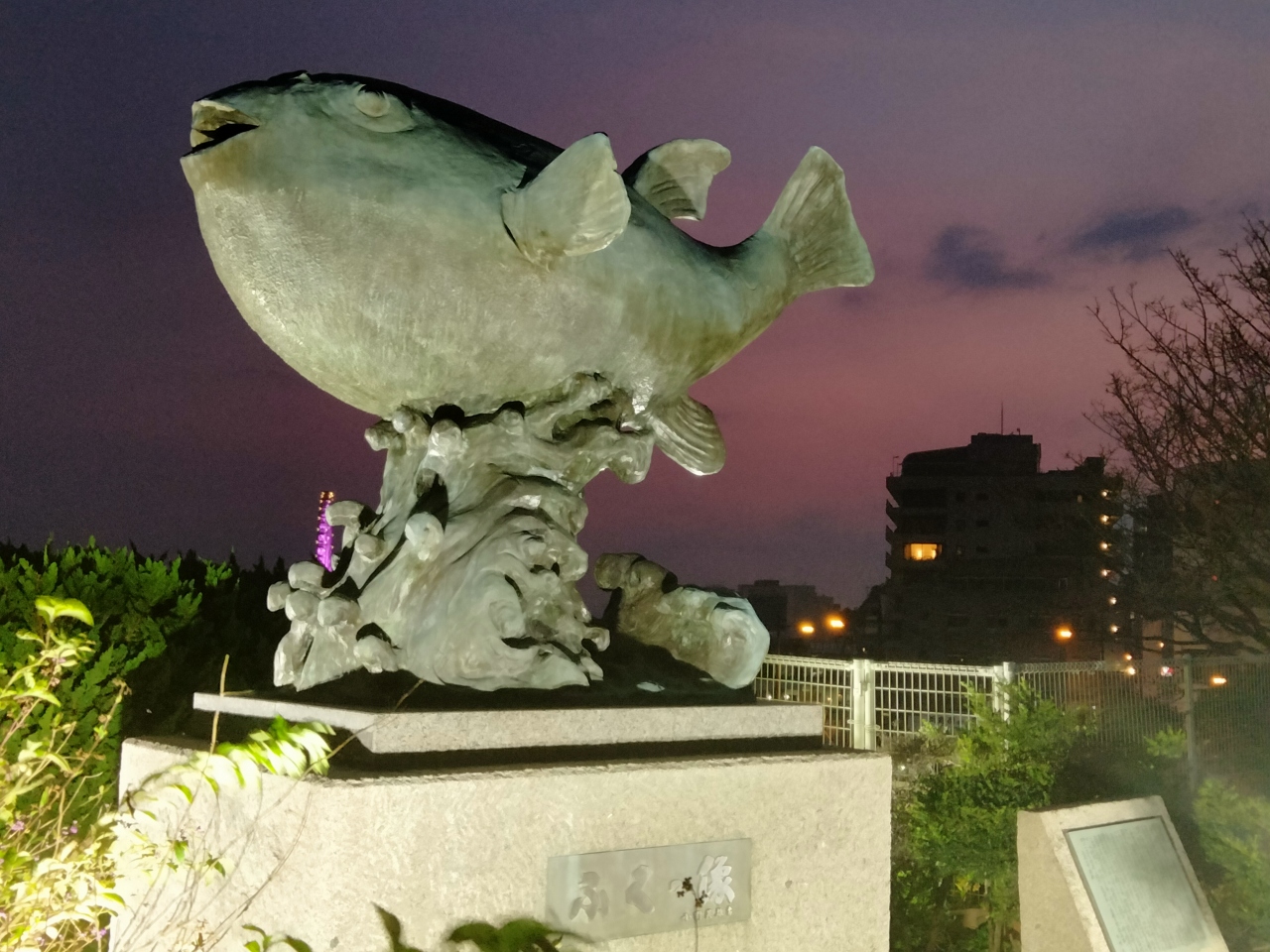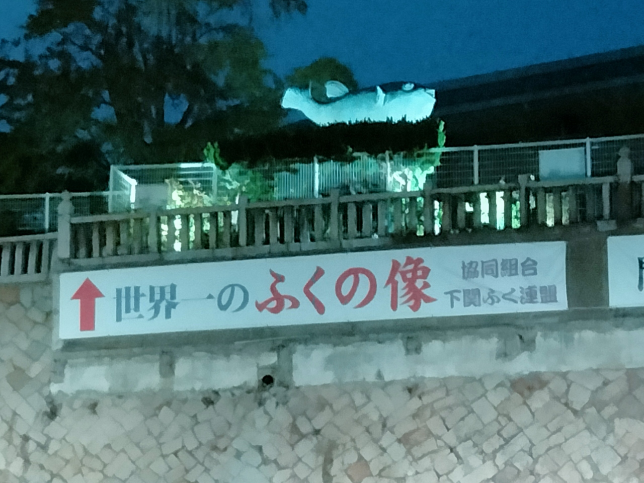 急な階段を上がると「世界最大のふくの銅像」が現れます。