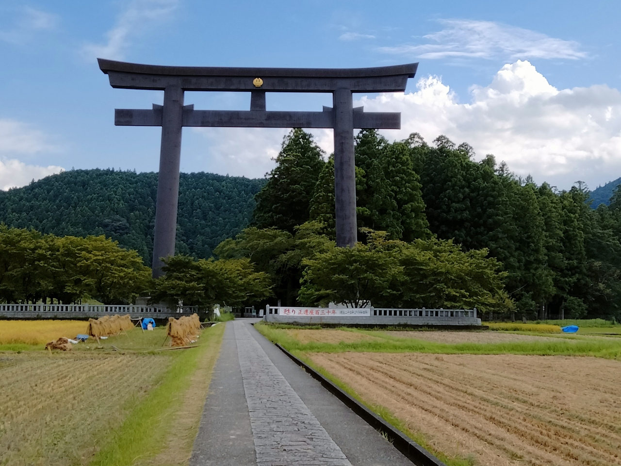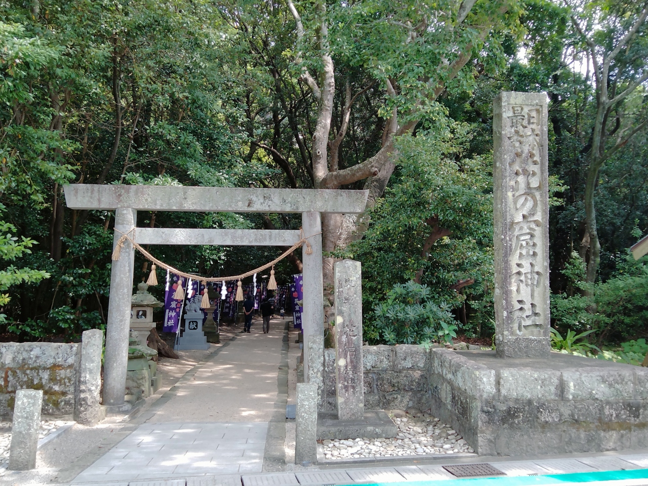 世界遺産センター脇から田んぼ道歩き高さ34mの大鳥居をくぐり、もう少し歩くと小さな石祠があるだけの聖地に着きます。