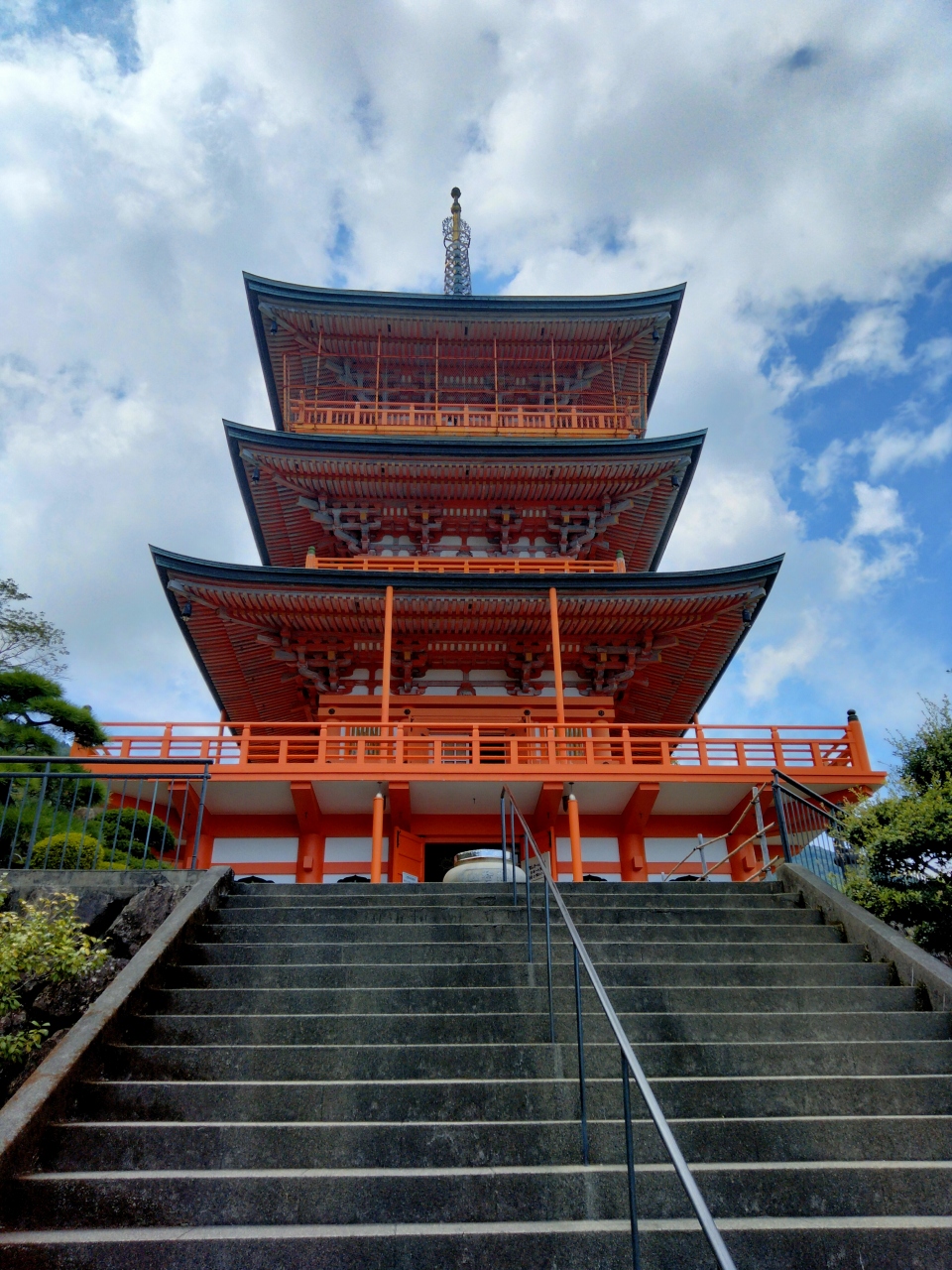 那智の滝から少しだけ熊野古道を歩いた気分になる小径を通って、熊野那智大社に行く途中にある朱色の三重の塔です。