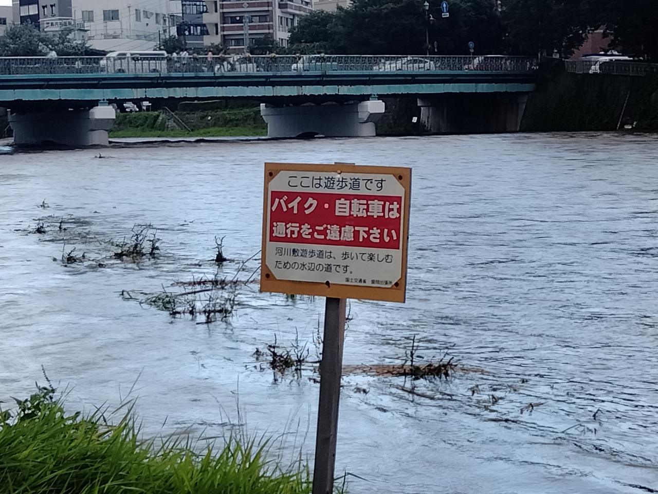 普段であれば、川の両岸は遊歩道になっていて歩ける様ですが、橋下まで濁流が押し寄せていました。