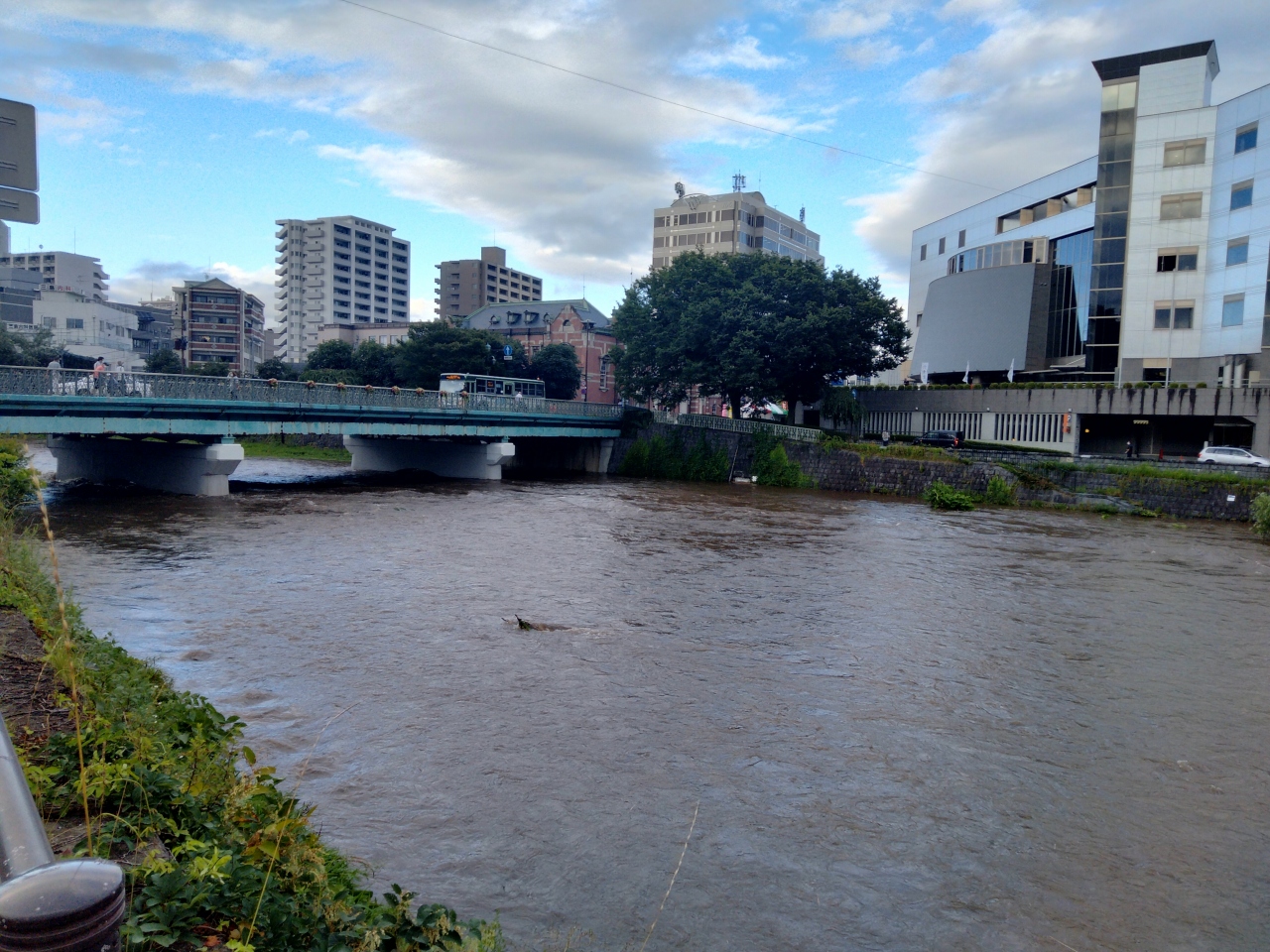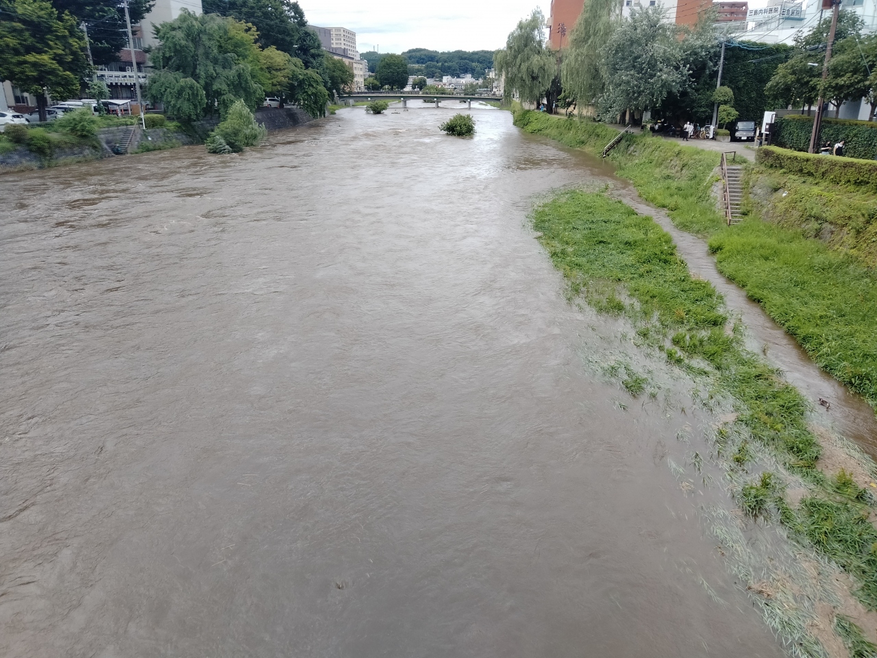 盛岡市中心部で、数日前の豪雨で増水した北上川の支流「中津川」です。