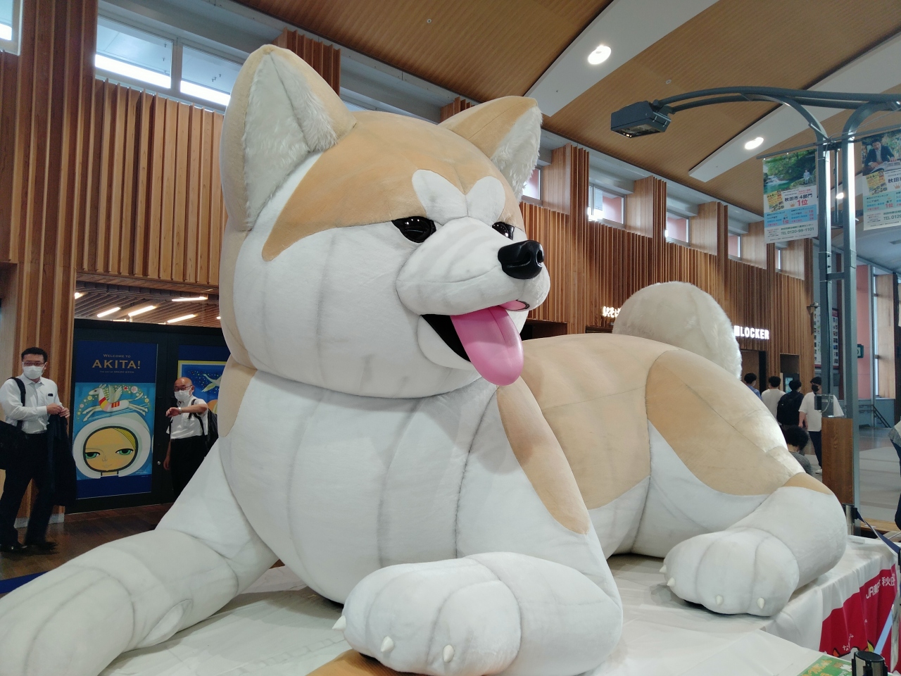 秋田駅コンコース(ぽぽろーど)で、「竿灯」と巨大な「秋田犬」のぬいぐるみ、ナマハゲ、で観光客を出迎えてくれました。