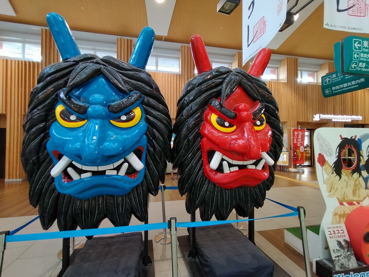 秋田の観光資源(竿灯、秋田犬、ナマハゲ)が観光客を出迎えてくれました