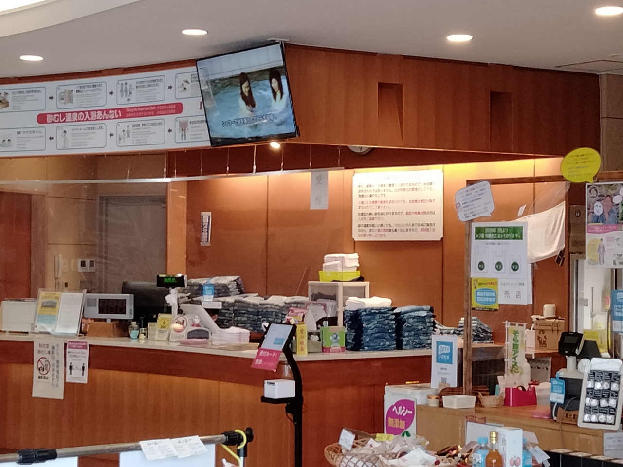 フロントにはドリンクバーやアメニティ(シャンプー等)のコーナーがあります。