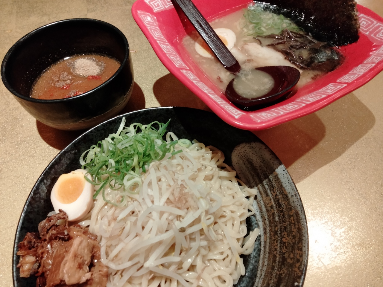 店頭のメニュー表示に惹かれて、熊本ラーメン(780円+黄金餃子)とつけ麺を食しました。