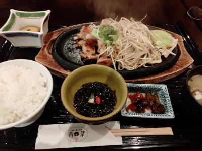 「黒さつま鶏ステーキ定食(1250円)」は、歯ごたえのあるゆず胡椒風味でした。