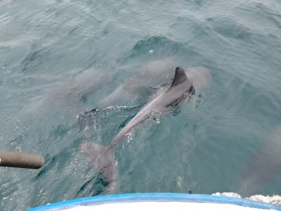 定員20名程度の船でイルカの生息地まで10数分で到着すると、数10頭のイルカをマジかに見ることができました。