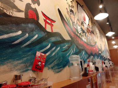 赤を基調とした店内には、大きく7福神が描かれていました。