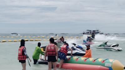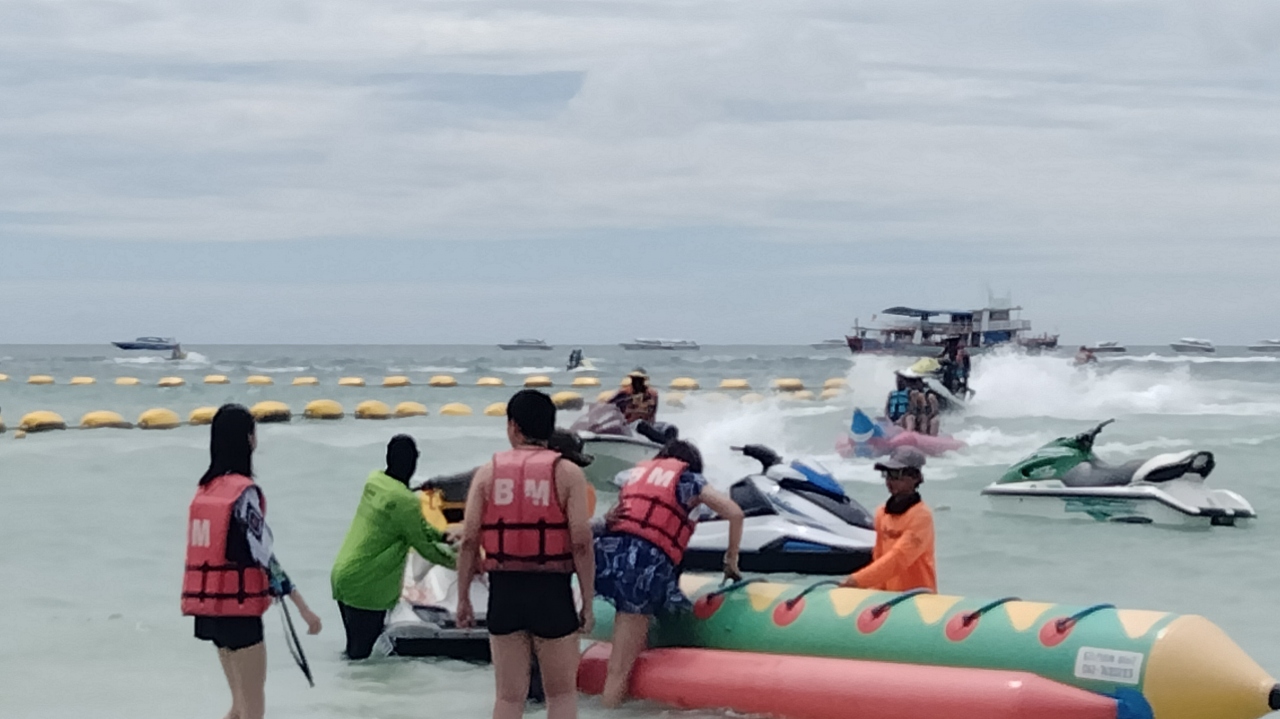 ツアー客と思われる人たちが、順番にジェットスキーやバナナボートではしゃいでいました。