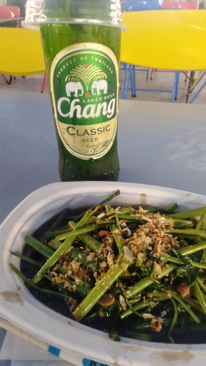 「空心菜の炒め物(80バーツ)」とチャーンビール(大瓶:100バーツ)をいただきました。