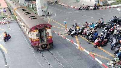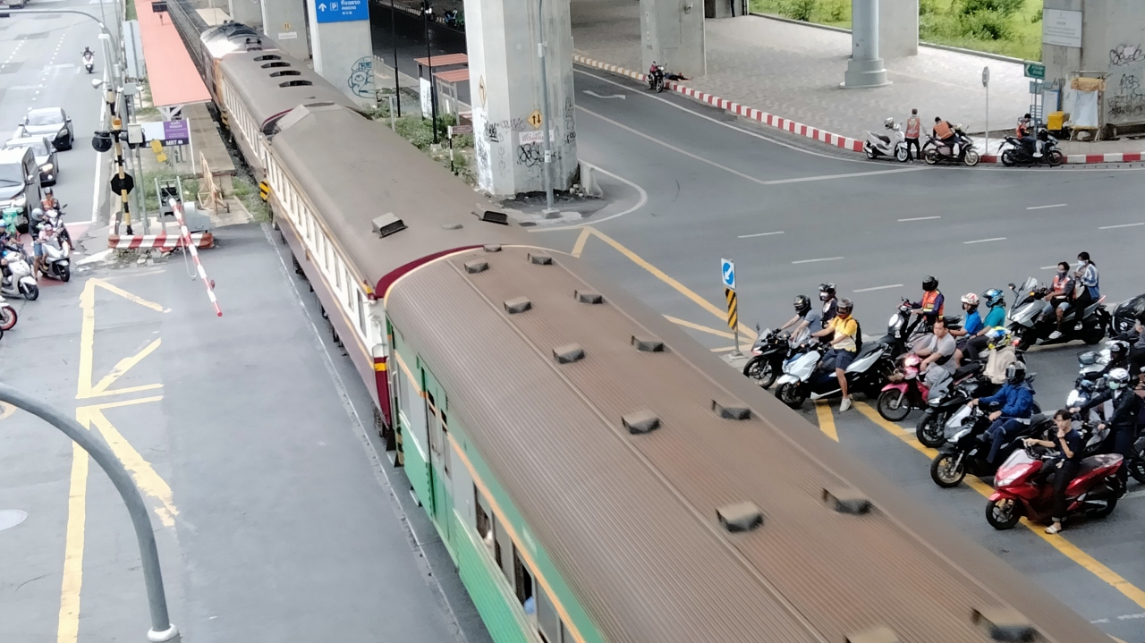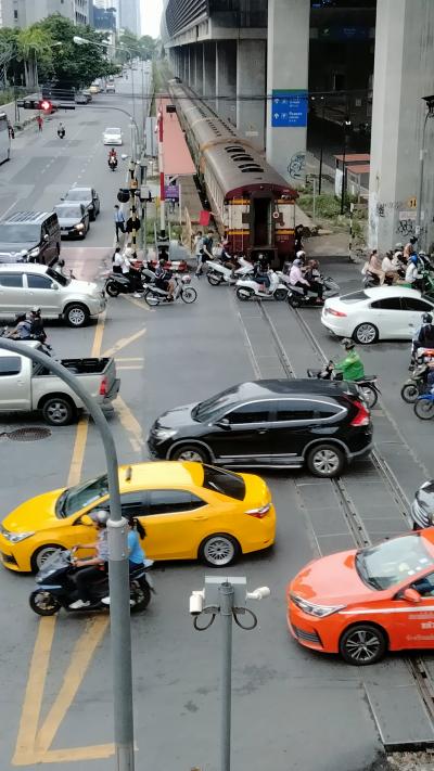 偶然、マッカサン駅に列車が到着したので、駅前の踏切の様子を高架通路から見ることができました。
